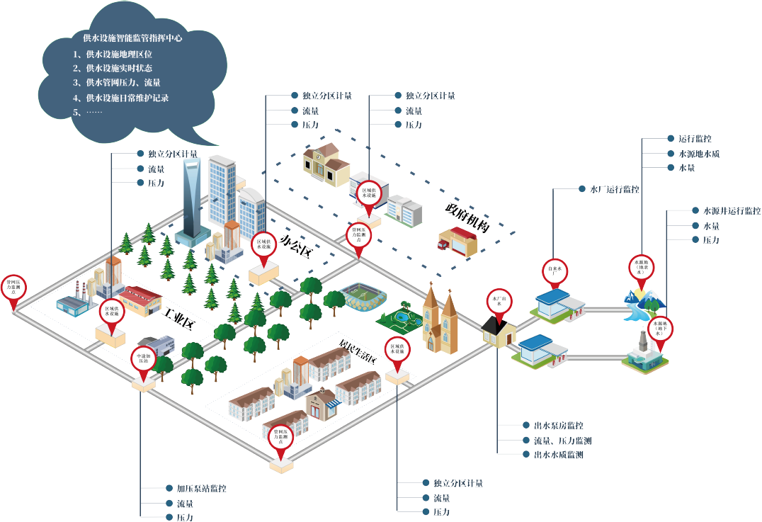 為實(shí)現(xiàn)供水設(shè)施精細(xì)化管理,通過集成水源、水廠、管網(wǎng)、二次供水的設(shè)施監(jiān)管數(shù)據(jù),構(gòu)建基于物聯(lián)網(wǎng)的覆蓋源頭到龍頭的供水設(shè)施的信息化業(yè)務(wù)平臺(tái)。該平臺(tái)通過終端傳感器采集設(shè)備的狀態(tài)信號(hào),通過物聯(lián)網(wǎng)通信裝置把采集的數(shù)據(jù)傳輸?shù)街付ǖ姆?wù)器,服務(wù)器解析數(shù)據(jù)后將其存儲(chǔ)到數(shù)據(jù)庫。監(jiān)控儀器設(shè)備的實(shí)時(shí)運(yùn)行狀態(tài)、位置、使用情況、壓力及流量等信息,實(shí)現(xiàn)原水、供水聯(lián)動(dòng),提高水廠生產(chǎn)運(yùn)營(yíng)智能化水平。