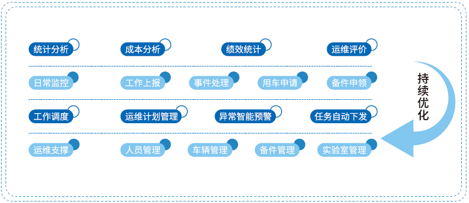 提供全流程數(shù)字化運(yùn)維服務(wù),通過在線監(jiān)測(cè)運(yùn)維管理系統(tǒng),實(shí)現(xiàn)模型擬合、數(shù)據(jù)分析、消息推送,移動(dòng)應(yīng)用等手段,提升人員、車輛、設(shè)備、耗材和工單等的管理效率。